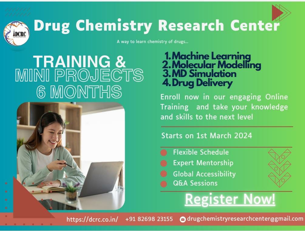 Home Events - Drug Chemistry Research Centre Training 6 Months Training Program on ML 6 Months Training Program on ML 6 Months Training Program on Machine Learning Starts on 1st March 2024 01. Machine Learning, 02. Molecular Modelling, 03. MD Simulation 04. Drug Delivery + Add to Google Calendar + iCal / Outlook export The event is finished. SearchSearch Recent Post Development of Machine Intelligence Related Algorithms webinar on Mechanistic Investigation of Synergistic Interaction of Drugs and Their Role in Cancer Treatment