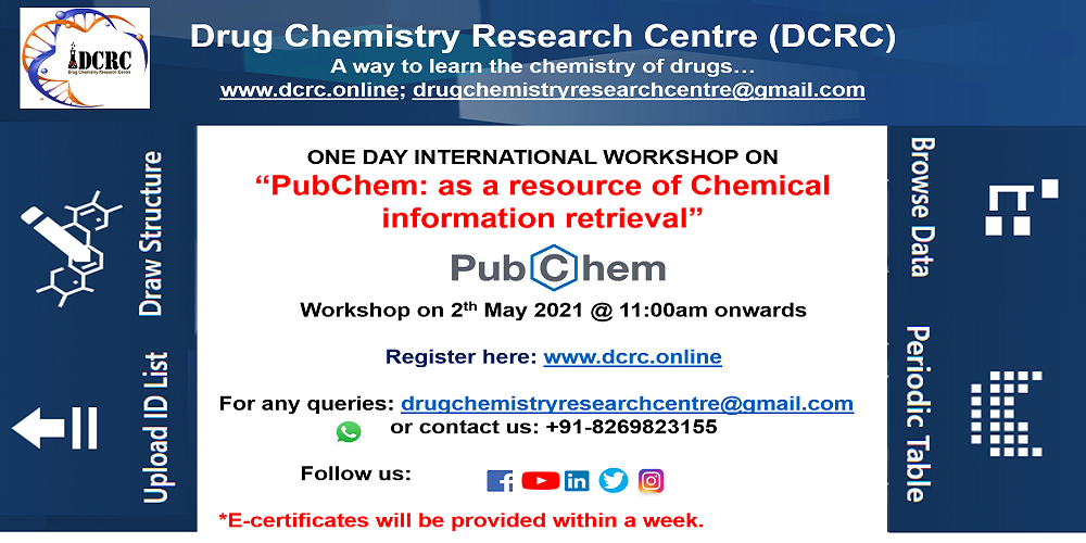 Drug Chemistry Research Centre (DCRC), Indore conducted a one-day international workshop on “PubChem: as a resource of Chemical information retrieval”, 2nd May 2021.